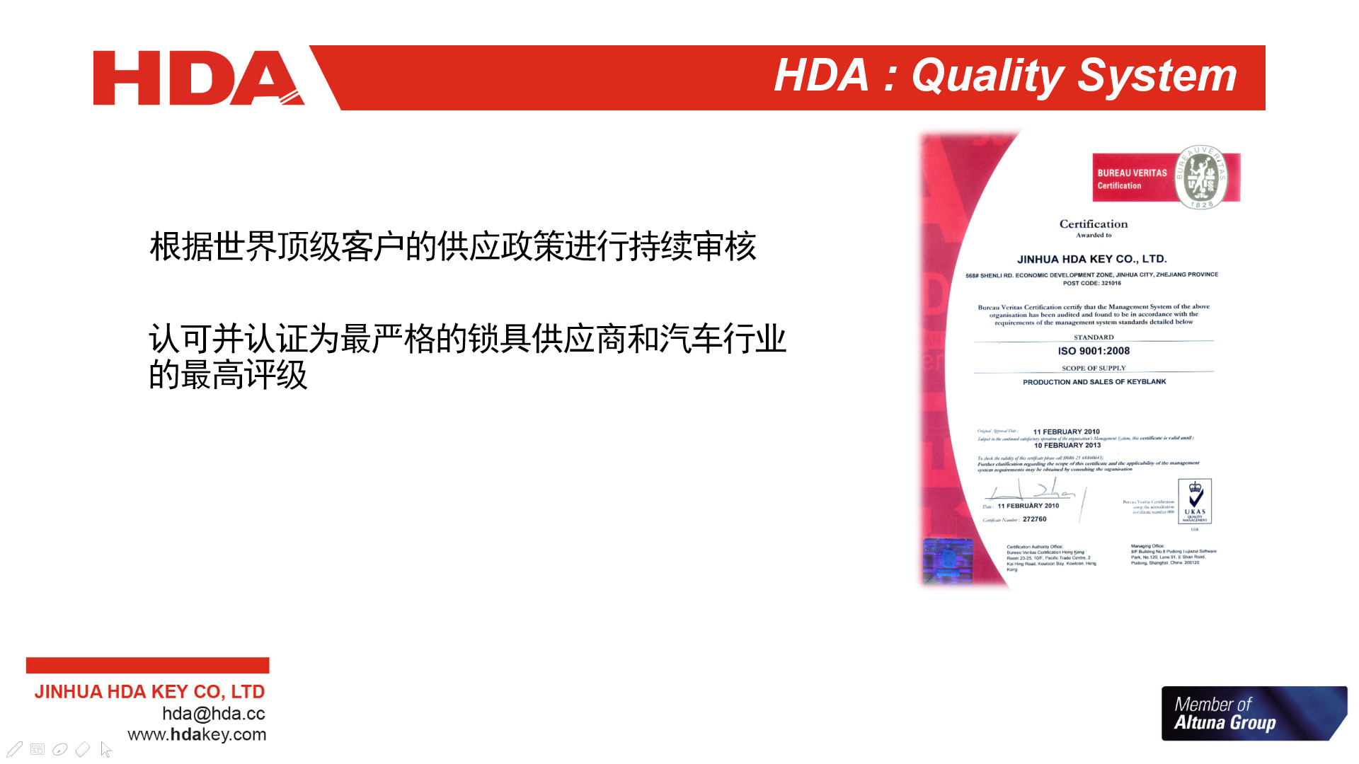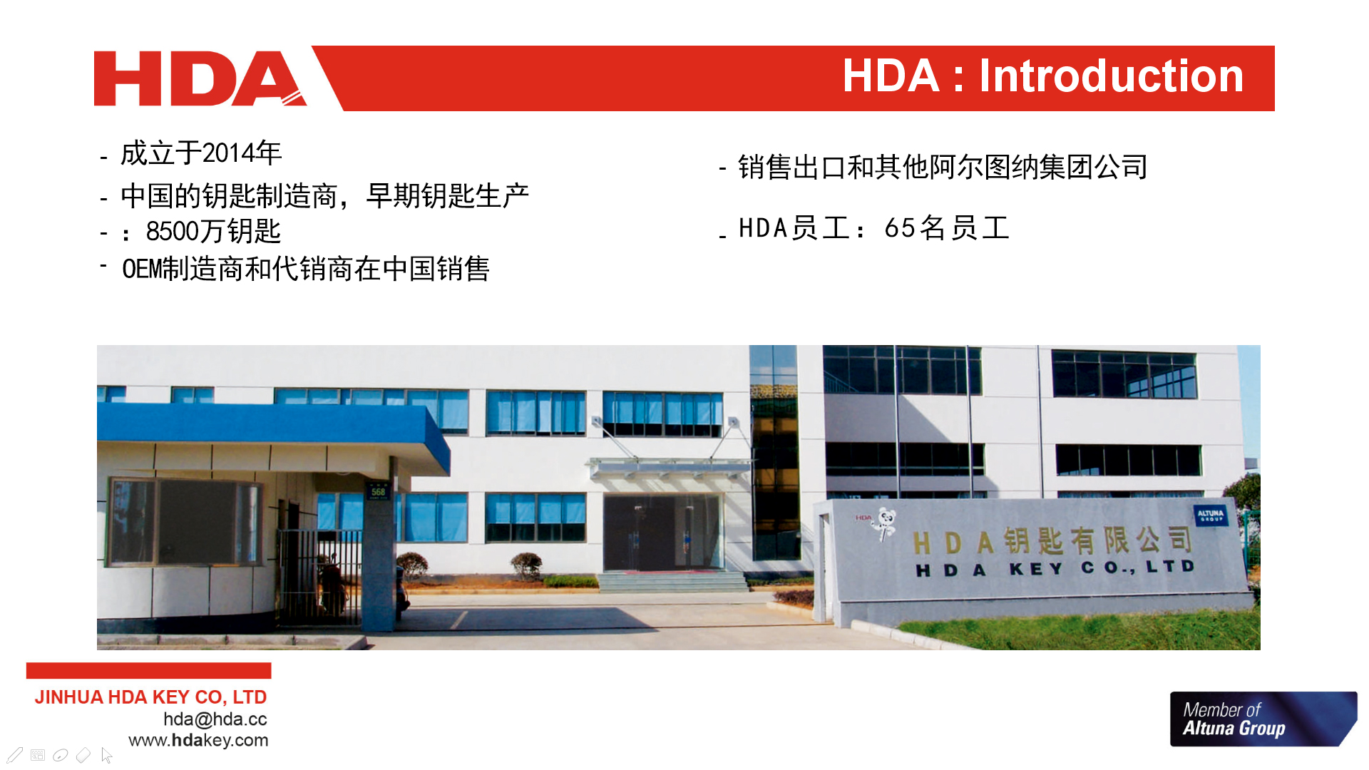 2005年,與歐洲三大鑰匙坯生產企業之一的西班牙JMA集團成立合資公司--金華HDA鑰匙有限公司。 2007年,轉為西班牙JMA集團獨資子公司。